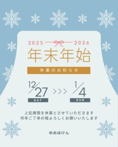 2025.12.16 / 最終更新日時 : 2025.12.16 yume ニュースレター ゆめほニュースレター最新号(2025年冬季号)を公開しました。 こんにちは、ゆめほけんです。 ホームページにゆめほニュースレター最新号(2025年冬季号)を公開しました。 ご一読いただけますと幸いです。 Bluesky